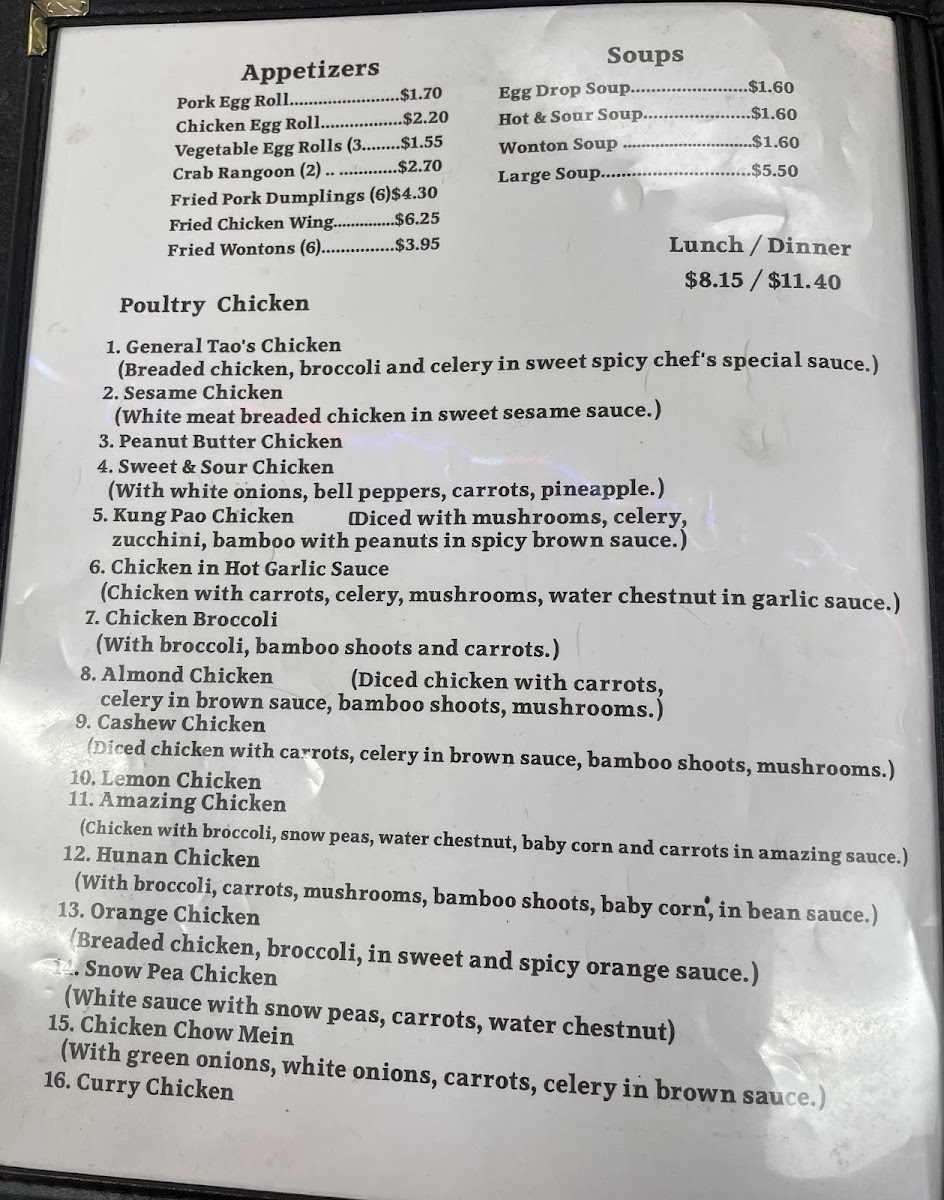 Indulge in their dinner offerings, featuring mouthwatering plates like the Mongolian Beef, laden with tender beef and vibrant vegetables, or the zesty Szechuan Beef, perfect for spice lovers. Poultry enthusiasts will delight in dishes like Orange Chicken and Hunan Chicken, celebrated for their fresh ingredients and bold flavors.